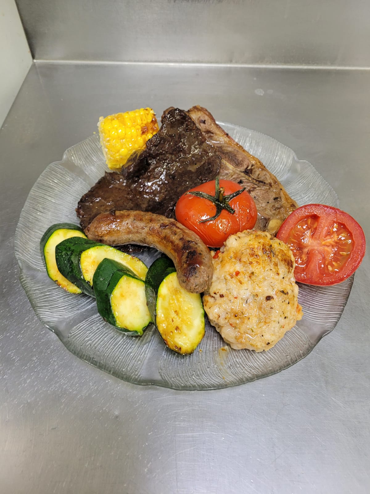 Lamb chop, buffalo or venison steak, croc or buffalo burger and add a game snag of choice. Grill some corn on the cob (we like to microwave the corn first for a minute or two to soften) fry some zucchini and you're good to go. Im going to say it again easy, there isnt much to it!