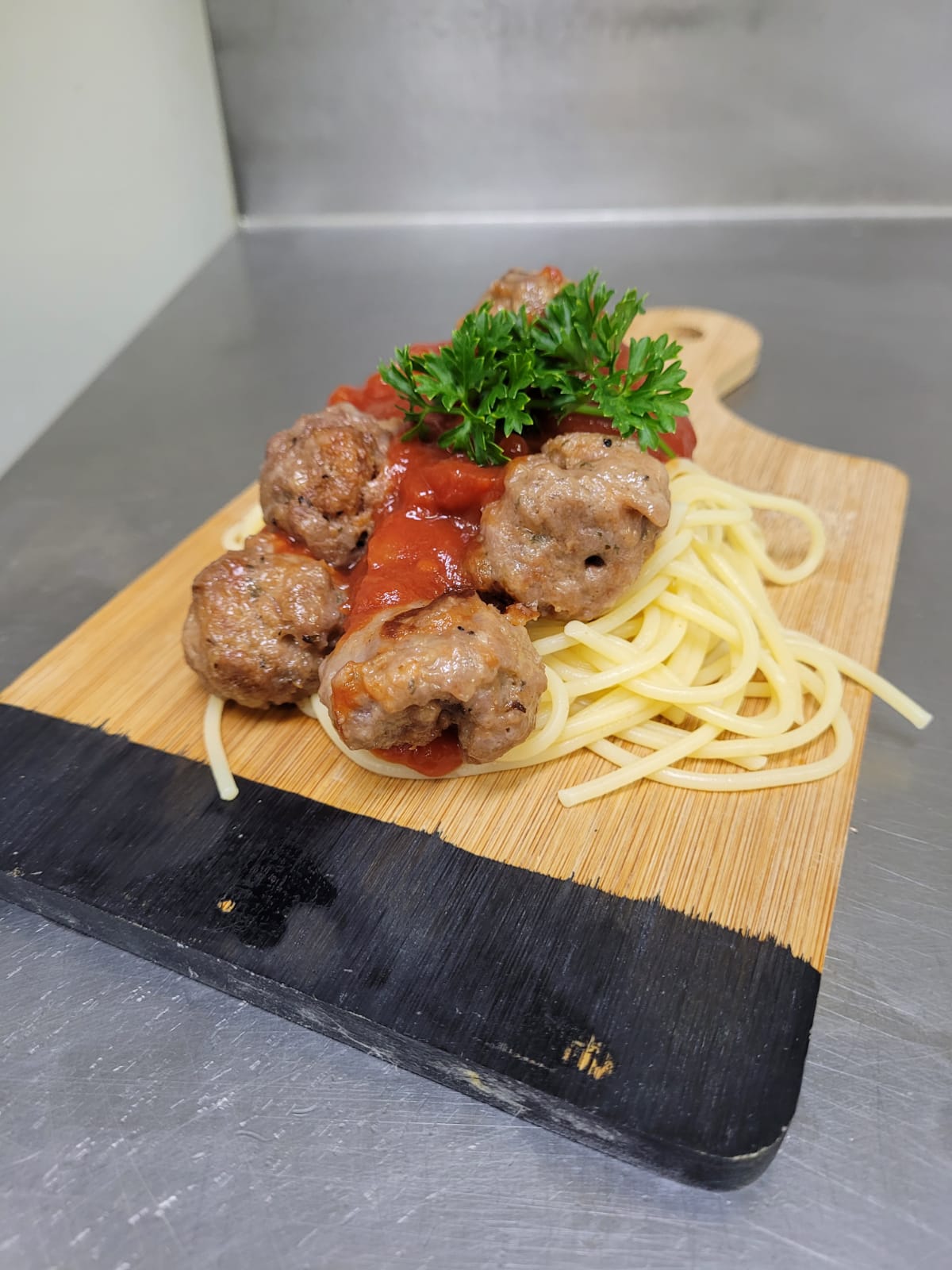 Pick any snags available (hint the cheesy game snags are the best if you like cheese), any of our range will work. Cut down the side and pull out the meat. Roll in to little balls and fry with some onion and garlic. If you don't like garlic etc, don't add it. Next, pick up a jar of your favourite pasta sauce or make it yourself if you're keen, mix and serve with the meatballs. If not a fan of spaghetti pasta, just use any type of pasta, it really doesn't matter.